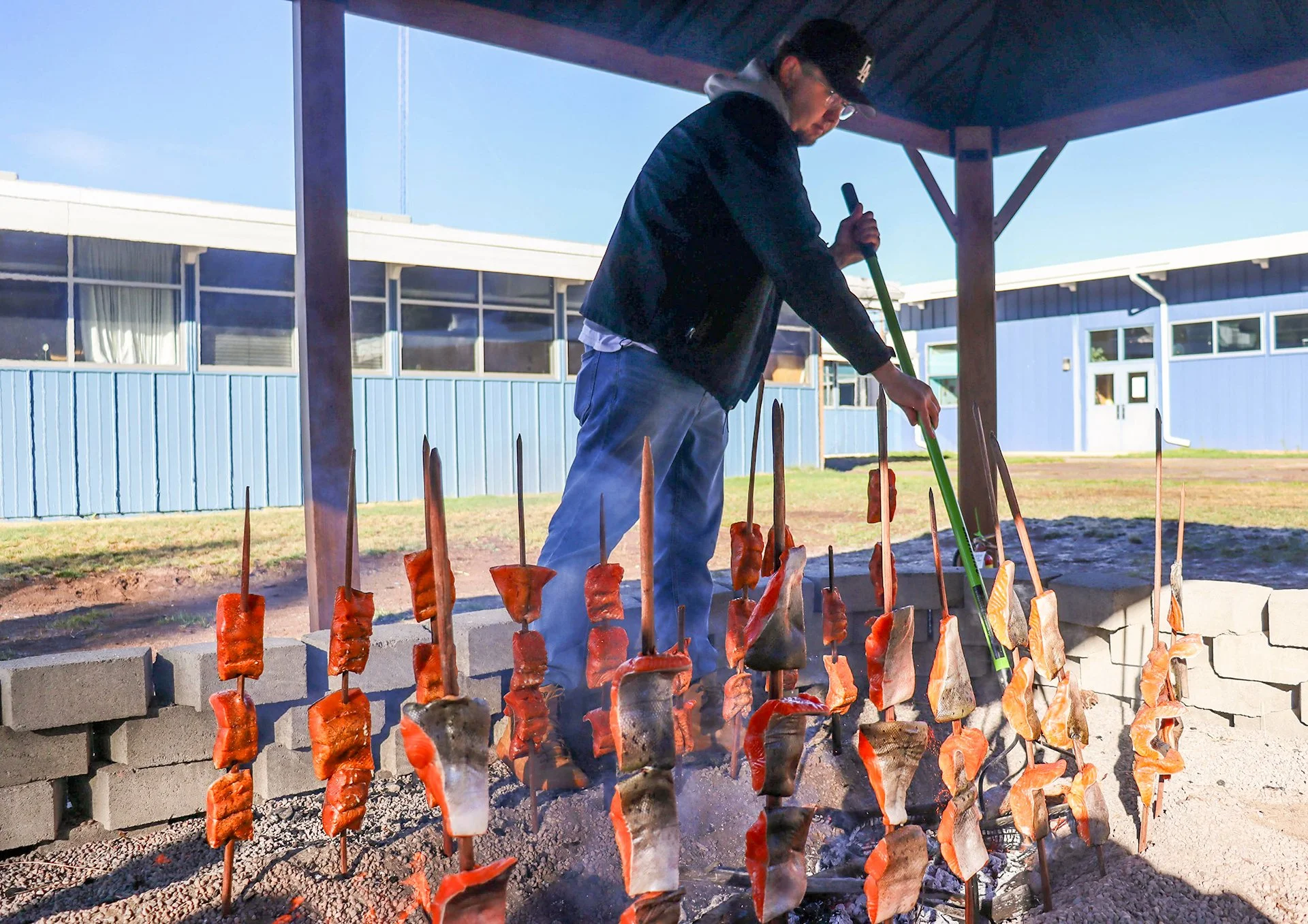 This year, 100 pounds of salmon were prepared and cooked on traditional redwood sticks, soaked in water. The sticks with salmon were placed around a 14X11-foot fire pit, designed and constructed last year by a Chiloquin senior. This past summer, former Chiloquin students, working with Jessica Kostick, community engagement manager for Healthy Klamath, built a gazebo over the pit.