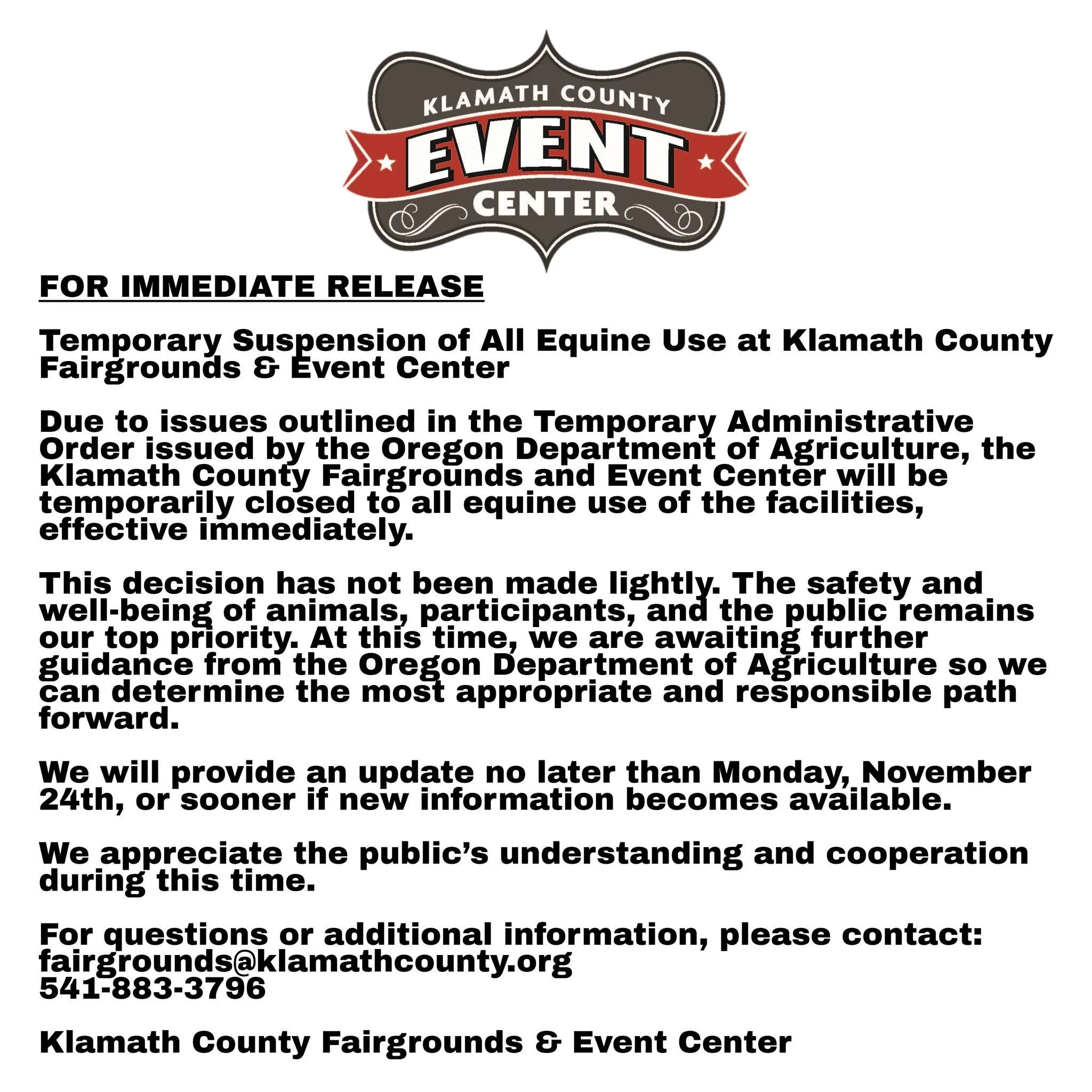 In response to the new temporary administrative order and out of caution, the Klamath County Fairgrounds & Event Center has issued an immediate suspension of all equine use at its facilities.