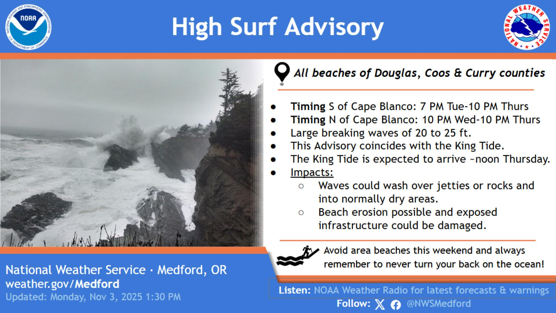 The advisory will be in effect from 7 p.m. Tuesday, November 4, through 10 p.m. Thursday, November 6, and includes areas from Coos Bay south through Curry County. Officials say waves could reach 20 to 25 feet, creating hazardous surf and the potential for minor coastal flooding.