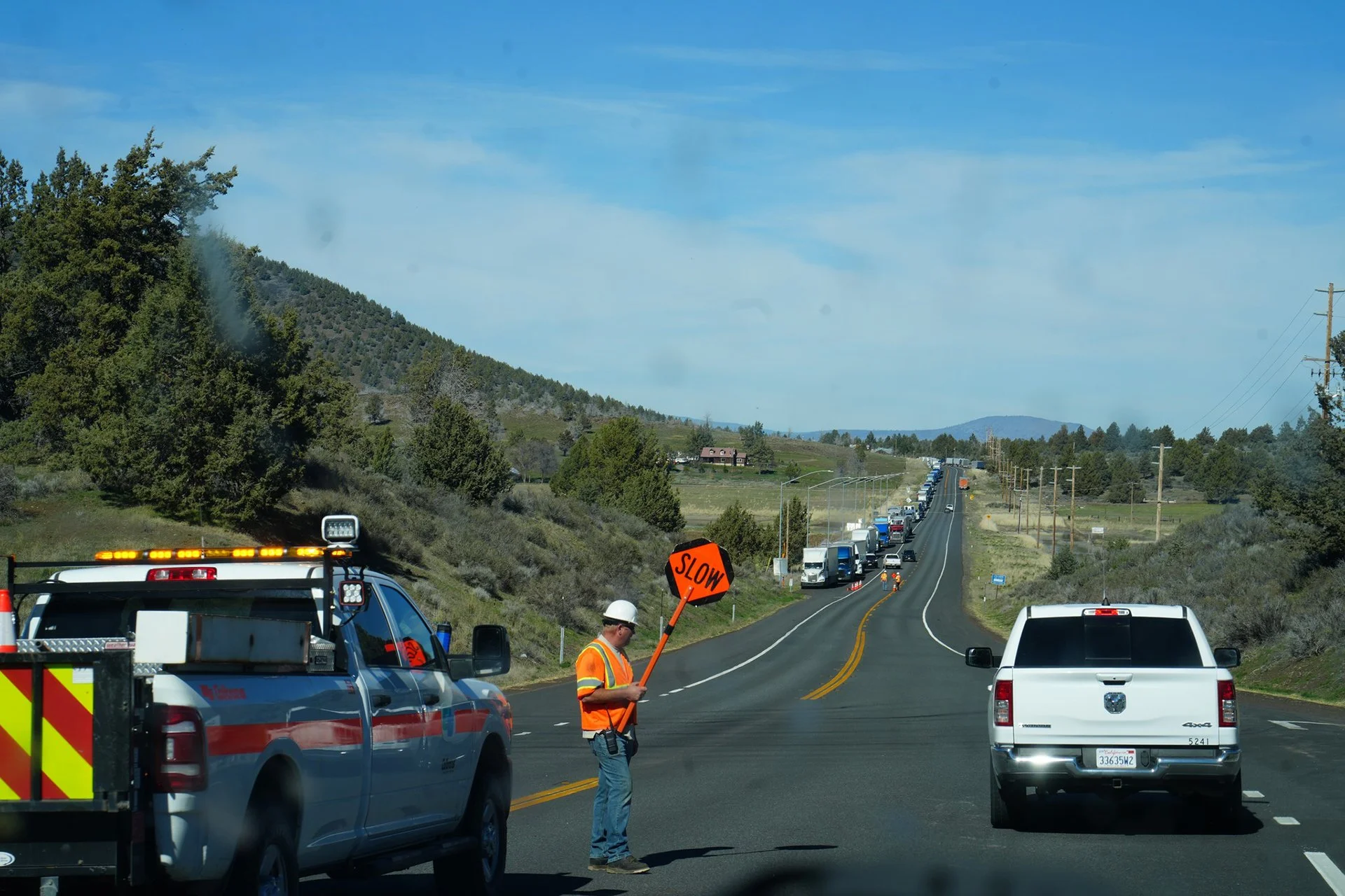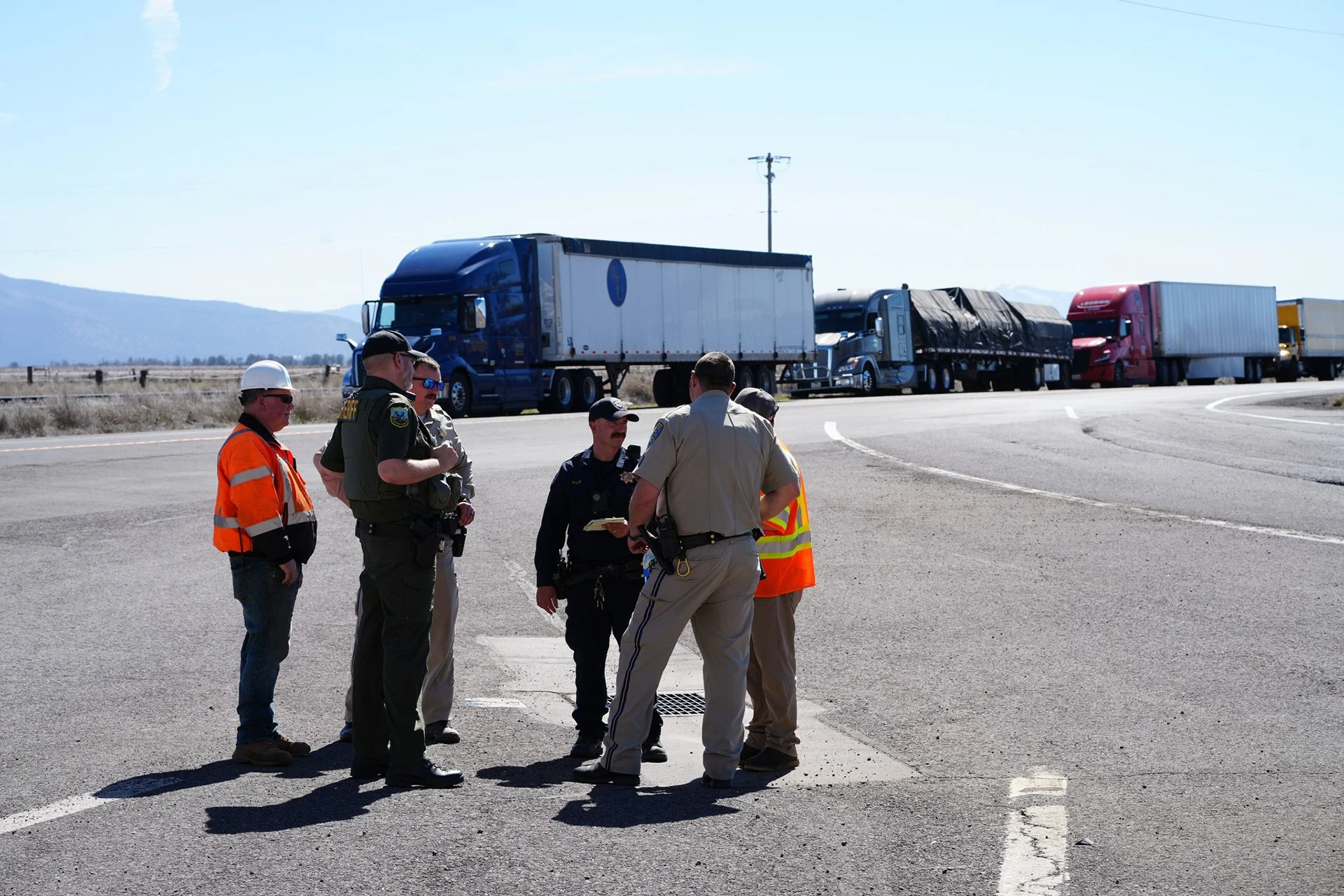 A CalTrans worker stands on US Highway 97 to close the roadway south of the Oregon border following the toxic spill, March 17, 2026 (Image, SCSO)