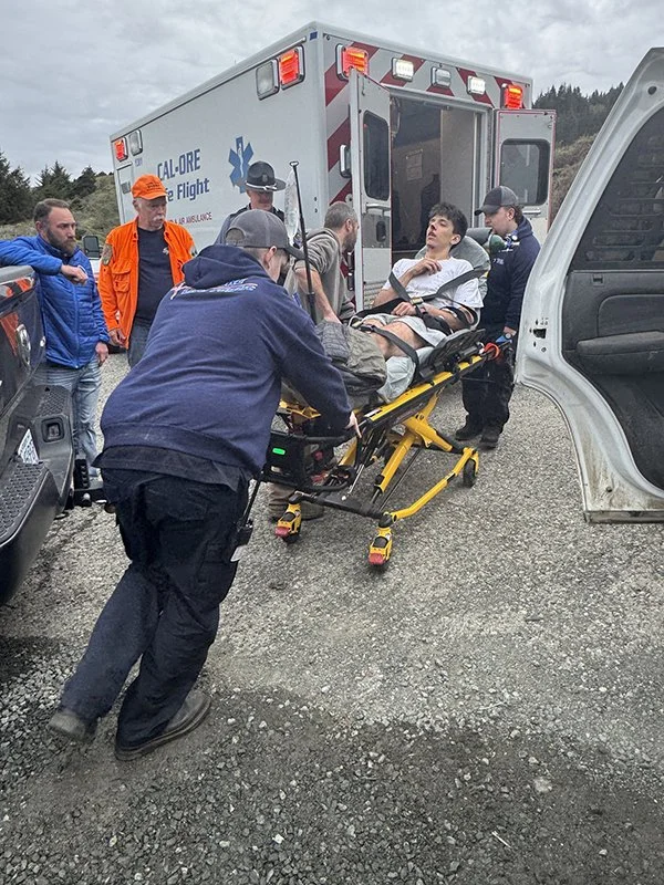 First responders assist an injured man after a 20-foot fall near Frankport north of Gold Beach. He was transported to Curry General Hospital for treatment. Photo by Curry County Sheriff’s Office.