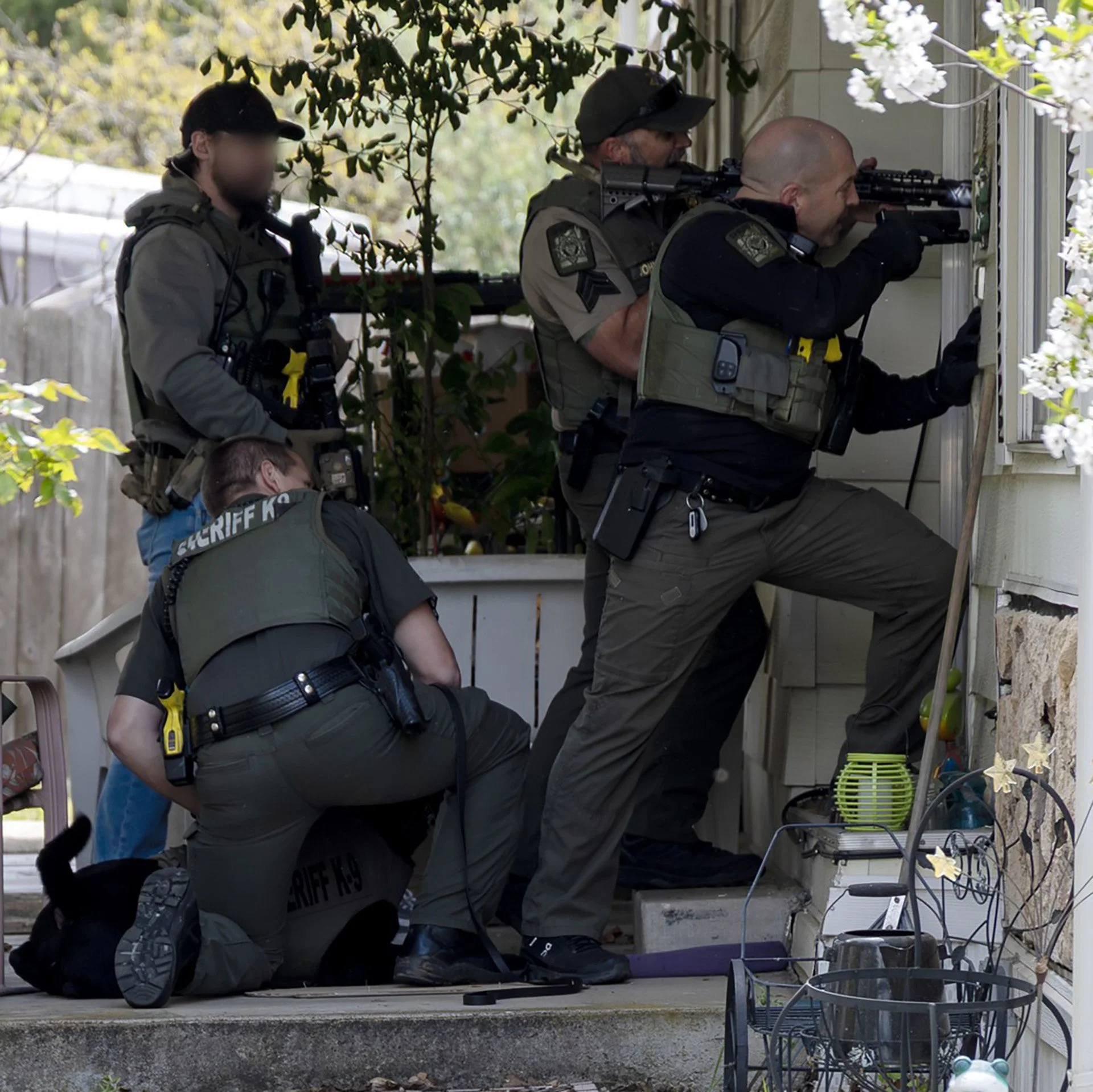 Jackson County Sheriff’s Office deputies and partner agencies position outside a residence in south Medford during the April 2 operation that led to the arrest of a barricaded suspect. Photo courtesy of Jackson County Sheriff’s Office.