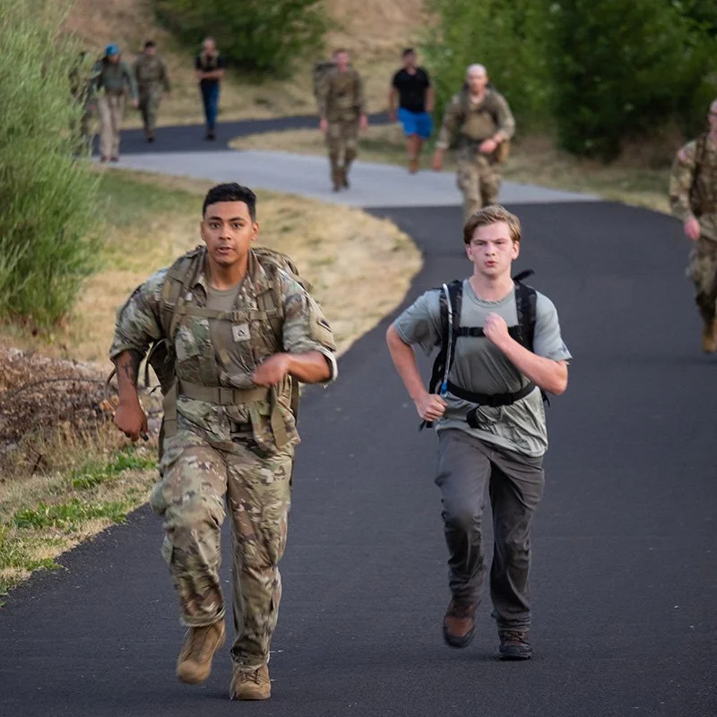Soldiers and civilians push the pace along the Bear Creek Greenway in Medford, Ore., June 8, 2025, during the Norwegian Foot March hosted by the Oregon Army National Guard's 1st Battalion, 186th Infantry Regiment. The 18.6-mile endurance march required participants to carry a 24-pound rucksack throughout the course. (U.S. Army National Guard photo by Maj. W. Chris Clyne, Oregon National Guard Public Affairs)