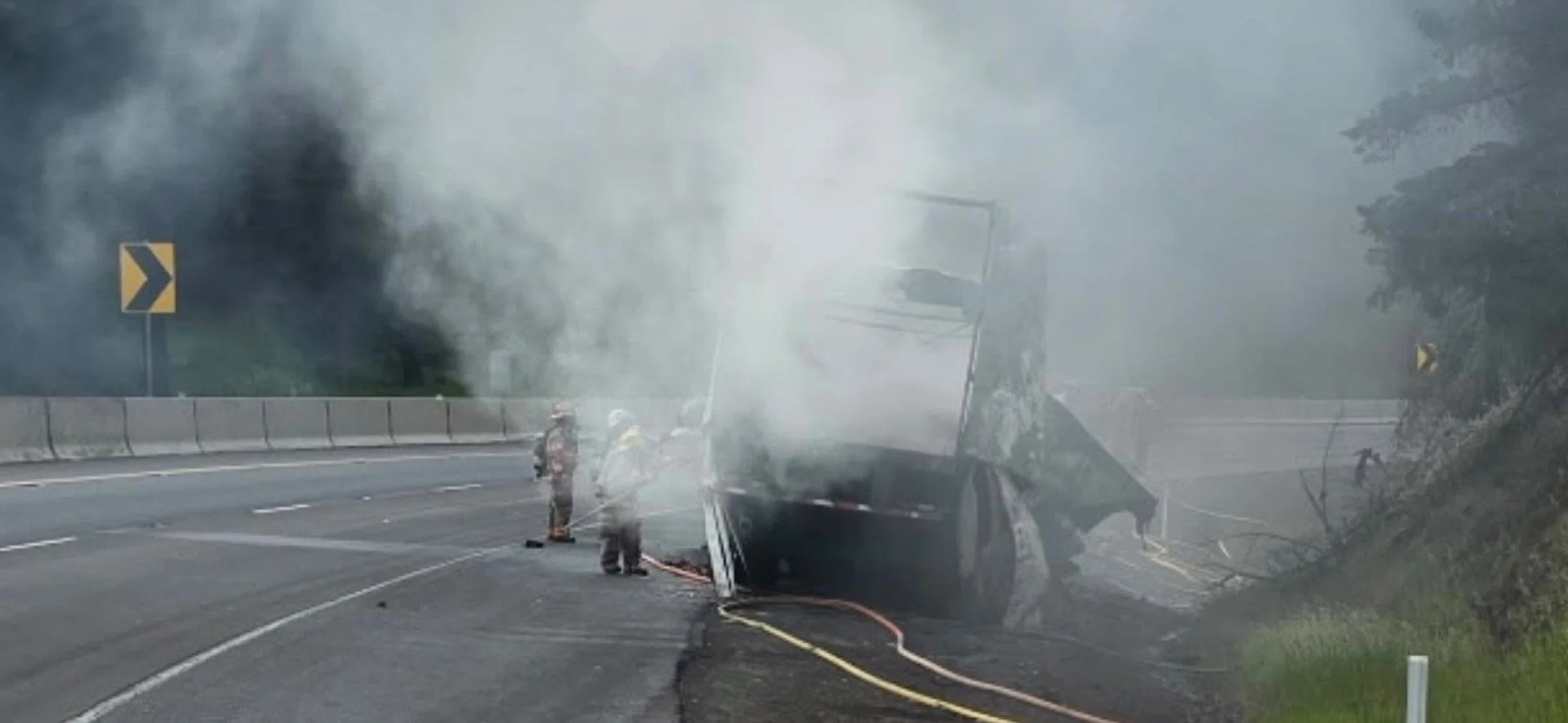 Hazardous cargo fuels intense blaze at Smith Hill Summit, sending one firefighter for treatment and closing northbound traffic lanes