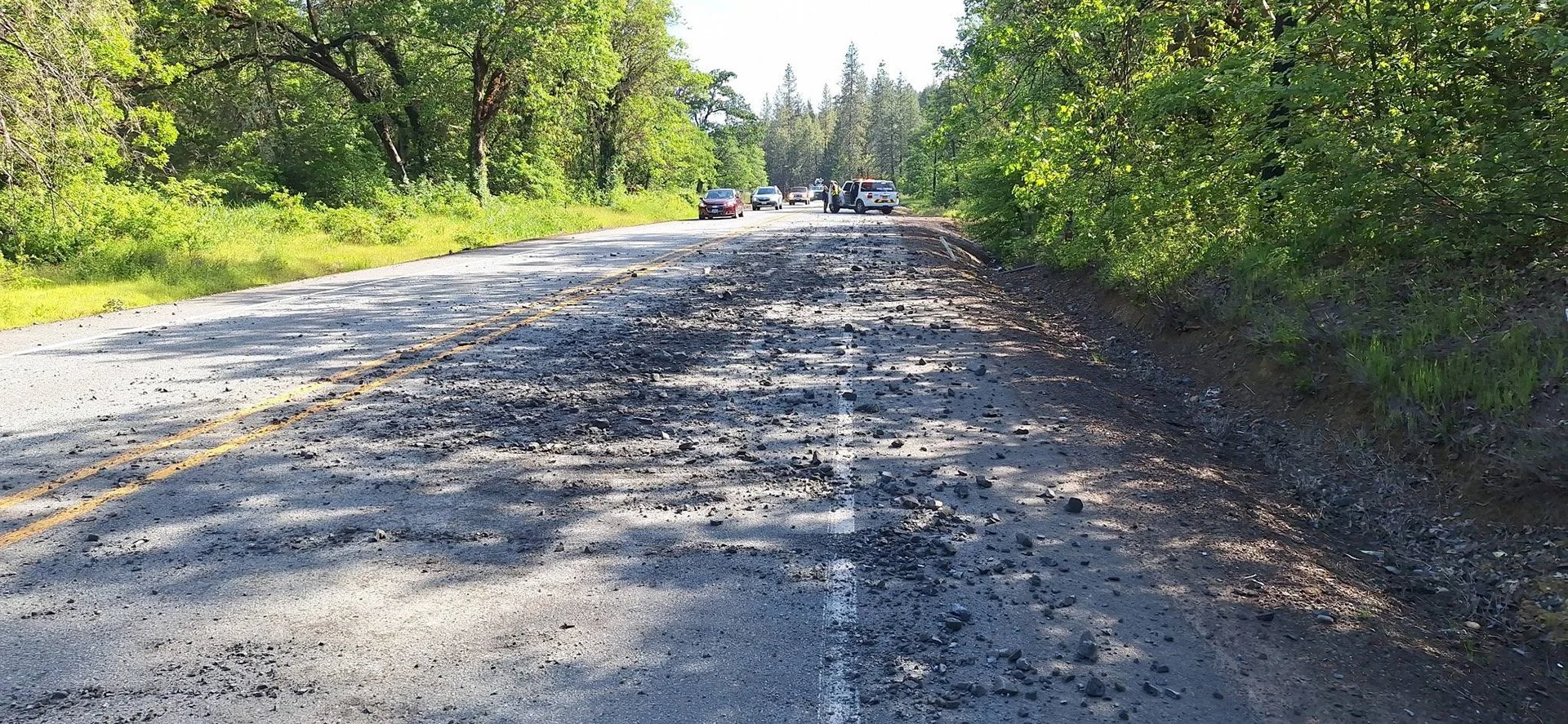 Officials said the debris, believed to have come from a dump truck or trailer, covered approximately a quarter-mile stretch of roadway. Additional rock debris was also reported near Redwood Highway and Deer Creek Road.